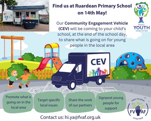The Community Engagement Vehicle (CEV) will be coming to school, at the end of the school day on Wednesday 14th May 2025, to share what is going on for young people in the local area.
